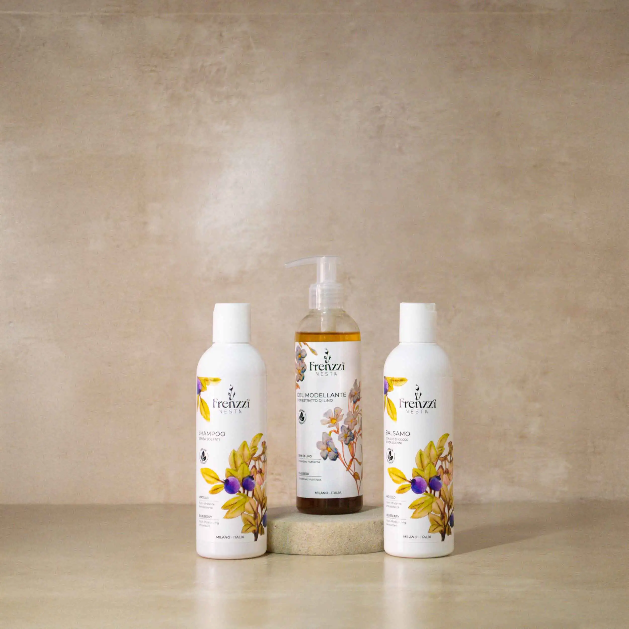 Gel di Lino: Estratto di lino, oli essenziali, estratto di fiori di caprifoglio.